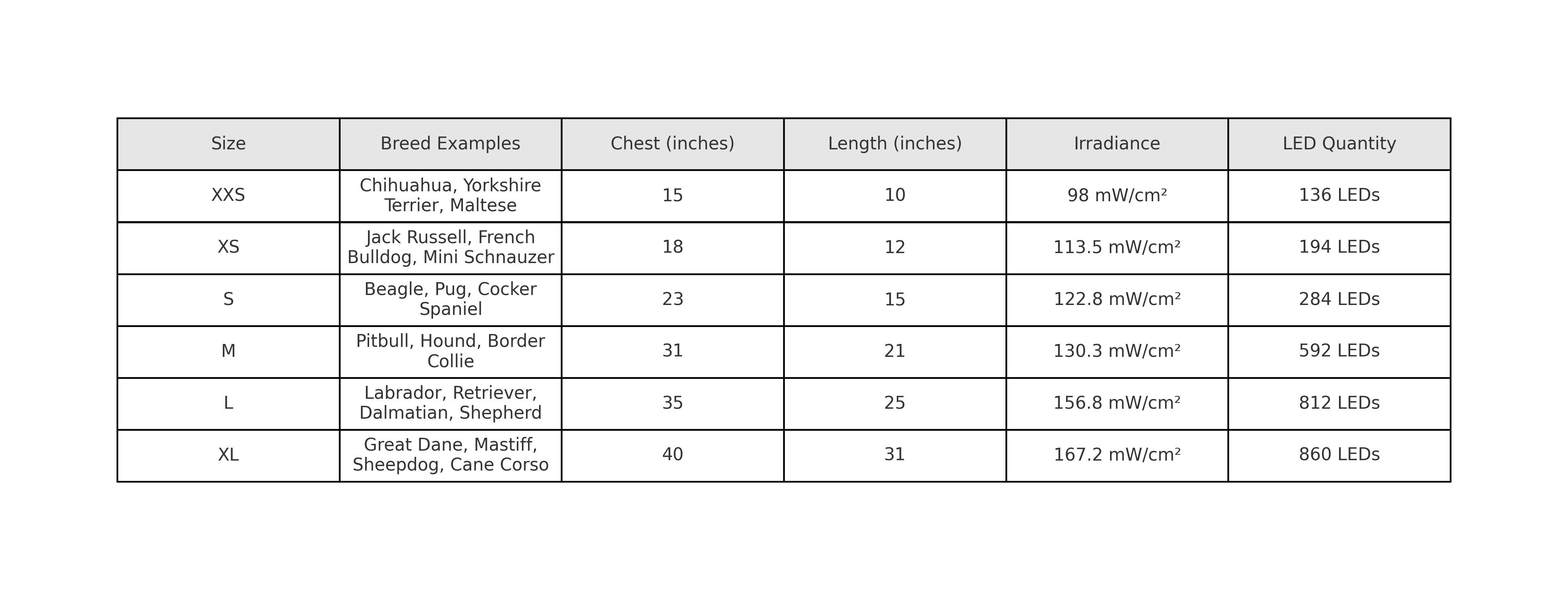 Irradiance and LED Quantity: Varies by size (see chart below)